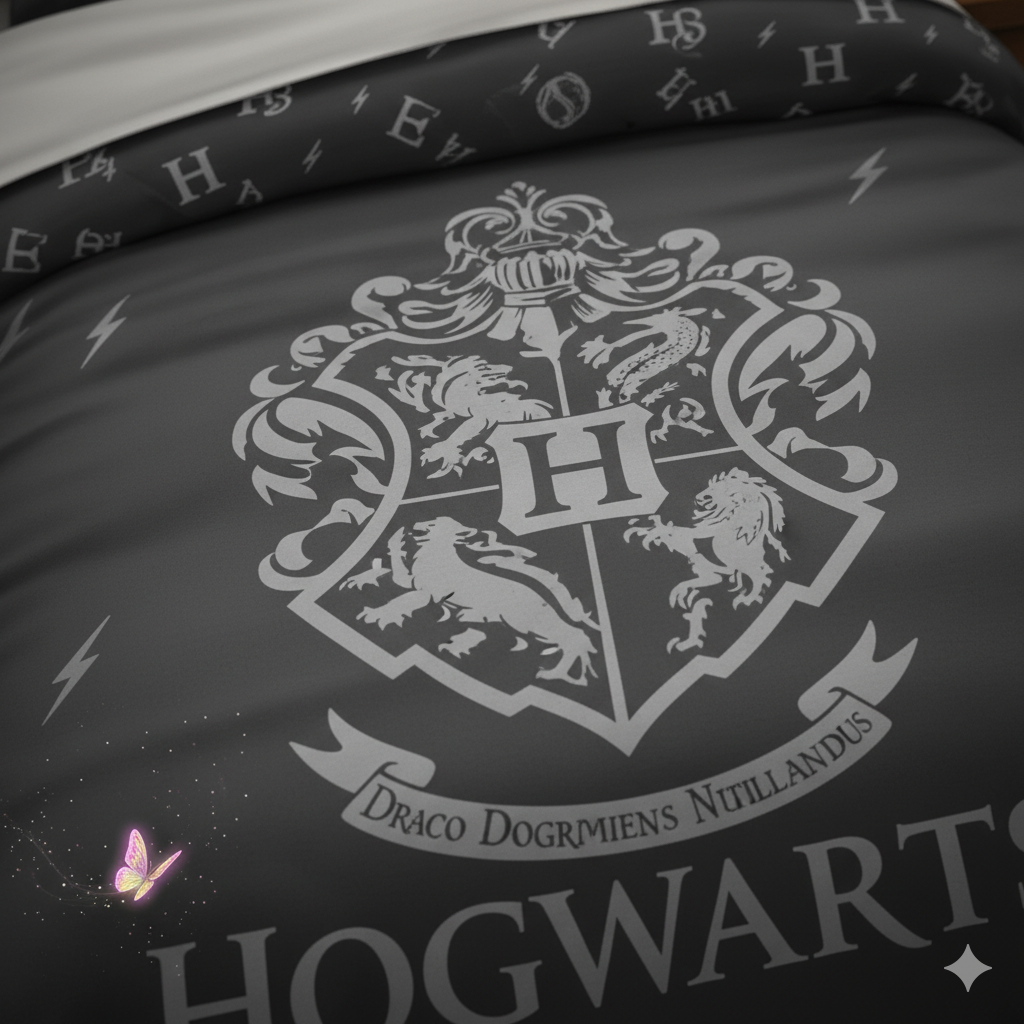 Housse de Couette : De couleur gris anthracite, elle est ornée du blason de Poudlard, reconnaissable à ses quatre animaux emblématiques (lion, serpent, blaireau, aigle) représentant les maisons Gryffondor, Serpentard, Poufsouffle et Serdaigle. Le mot « HOGWARTS » est inscrit en dessous du blason dans une typographie classique. Le design est épuré et sophistiqué, s’intégrant facilement à différents styles de décoration. La particularité « phosphorescente » suggère que certains éléments du design (probablement le blason et/ou le texte) s’illumineront dans l’obscurité, créant une ambiance magique.